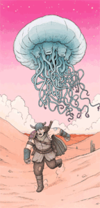 The 45-page Player’s Guide includes the class material from the corebook and adds several new cultures (Dreamer, Desert Weirdo, Onieri, Transdimensional Tourist) and a new class, Nightmare Slayer. Strange Tales of the Painted Wastelands presents a new “aberrant tome of unspeakable things,” a guide to the tourist trap/grave of the Conqueror Wyrm, and hitherto unmentioned weird objects and items. The Quest Unpronounceable is a 50-page haunted-house dungeon crawl with a strong flavor of interdimensional bleed. The behaviorally challenged Mr. Unpronounceable invites the player characters to become cleaners/adventurers at the Crimson Manse. He gives them a simple mission: Prop all the doors open. But the Manse, most liminal of all liminal architecture, contains floating heads, necrophones, predatory sea turtles, and many, many Mr Unpronounceables. Think Adventure Time meets House of Leaves.